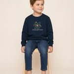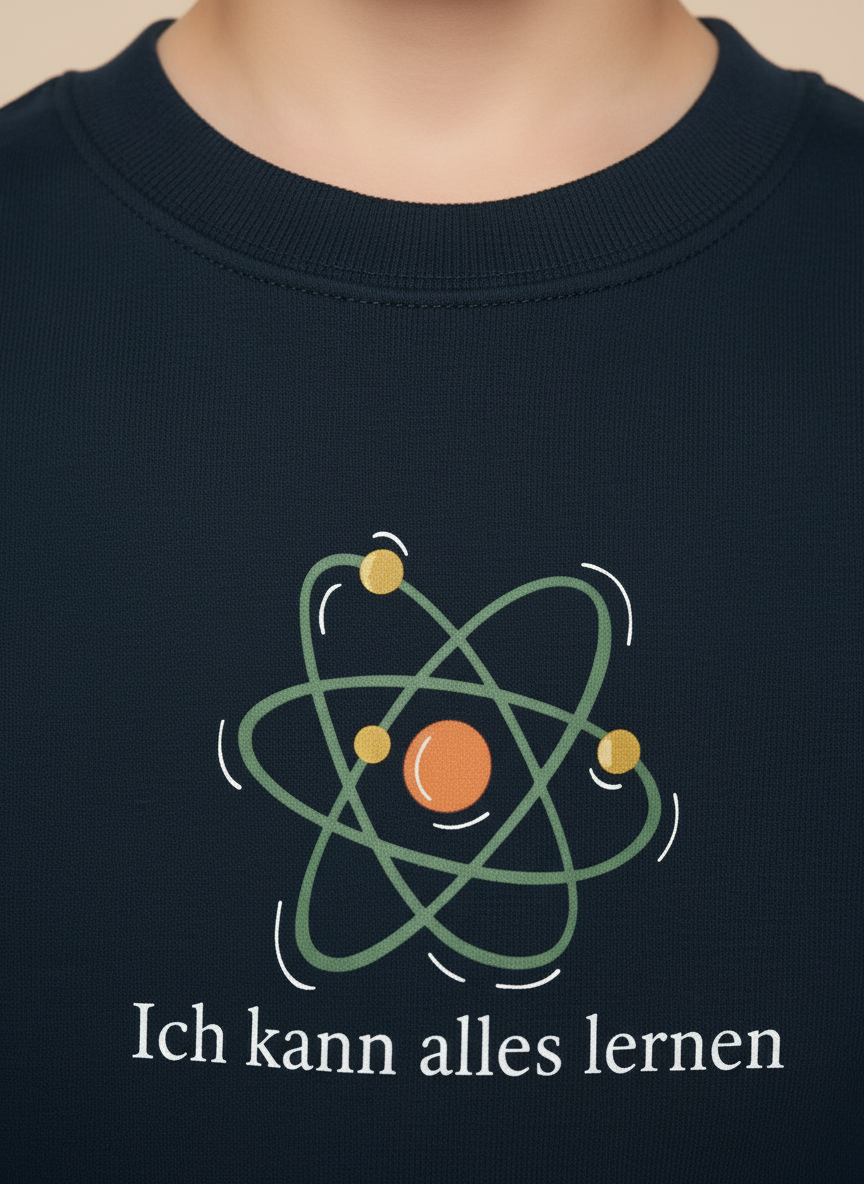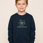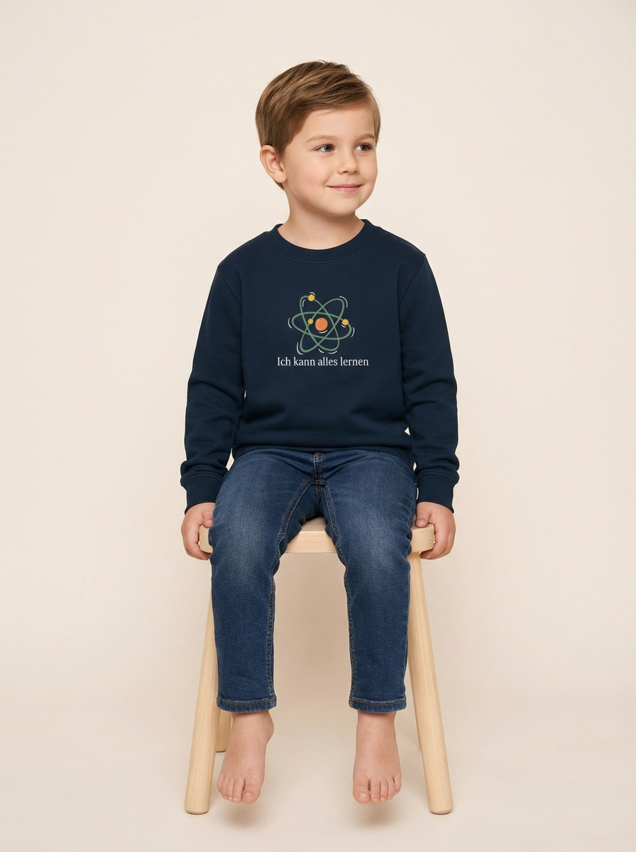 navyfarbiges Kinder-Sweatshirt mit der Aufschrift „Ich kann alles lernen“ unter einer stilisierten bunten Atom-Grafik. Das Design vermittelt Neugier, Lernfreude und Wachstum.